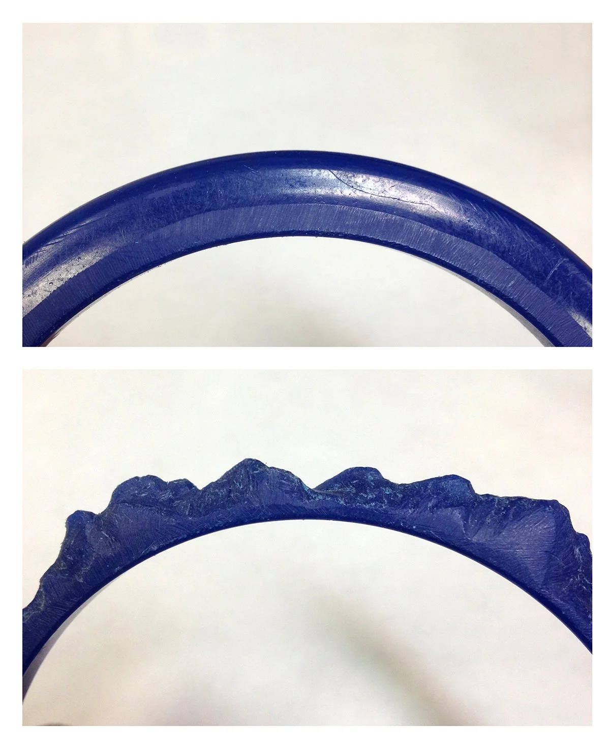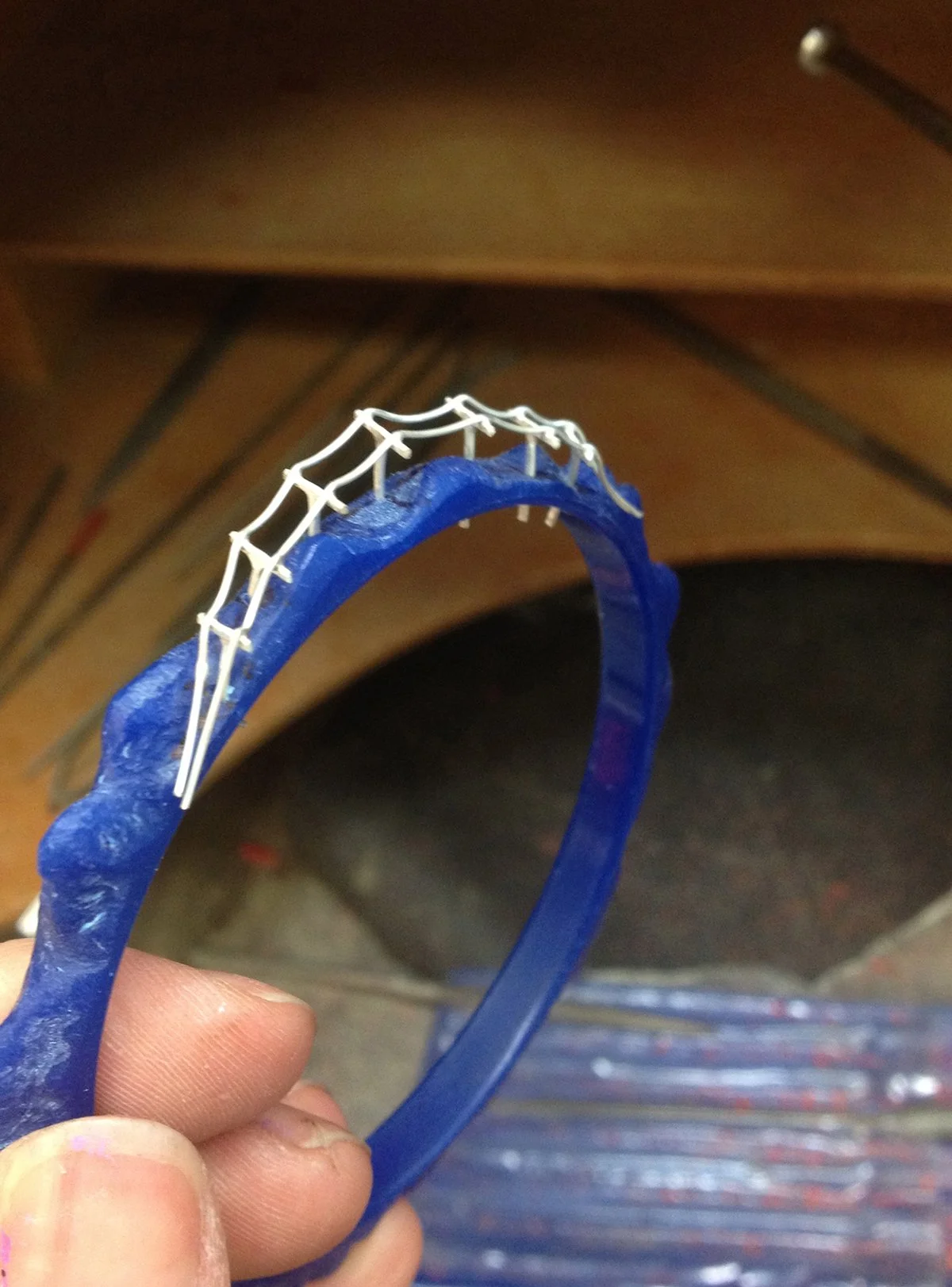 I happened to start this current incarnation of RJM at the same time that I started a residency at the Houston Center for Contemporary Craft. I unpacked my studio, my materials, and my life in this new flat and sprawling city, famous for it’s oil wealth, leaving behind the Appalachian Mountains. I have come to think of the towering electrical pylons and the immense interstate overpasses as the recognizable land features here. With these images in mind I picked up the pieces of jewelry in the pile with the least amount of charm or personality- the ubiquitous plastic bangles- and started removing material.