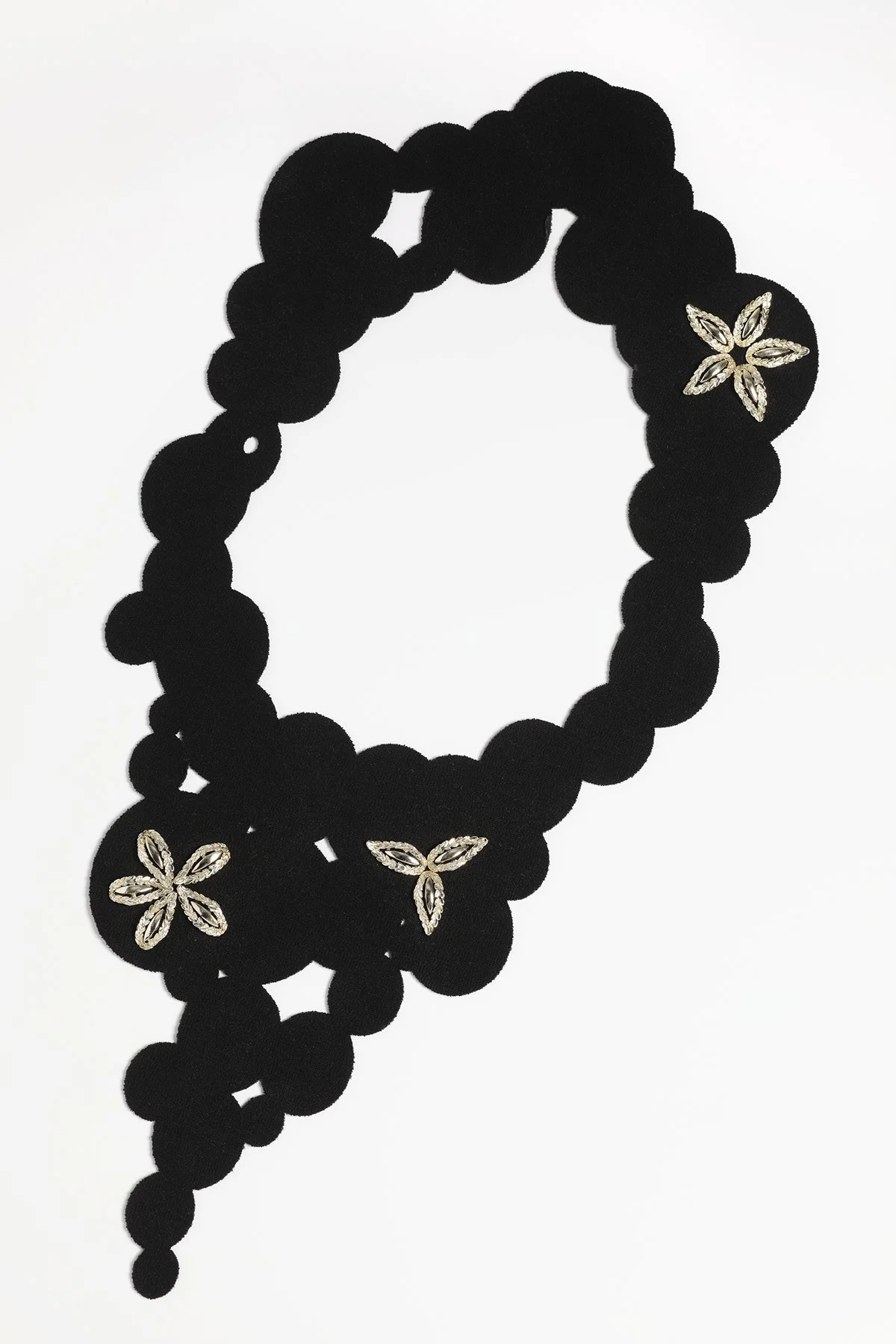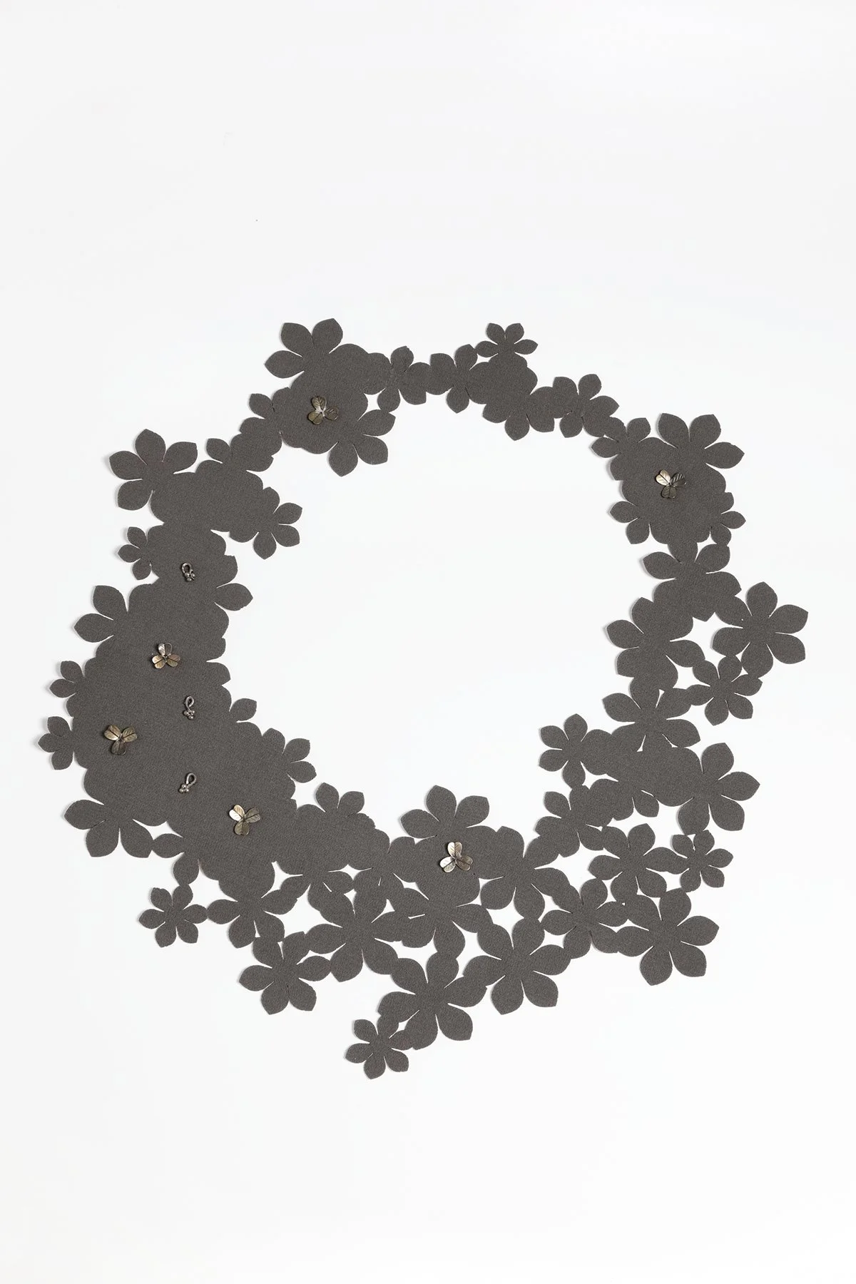 I'm trying to keep my material use predominantly recycled objects. So at this point I'm working with recycled clothing, laser cut as the base layer and then building up. I want these pieces to feel clean and crisp and new, even though the materials are all reused.