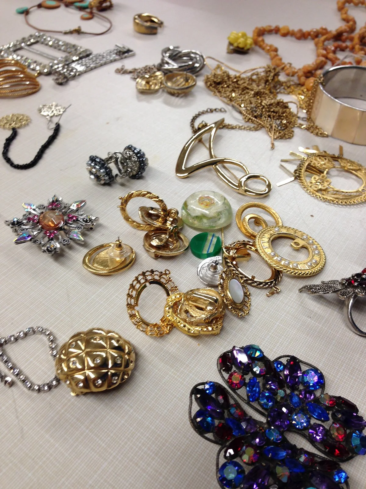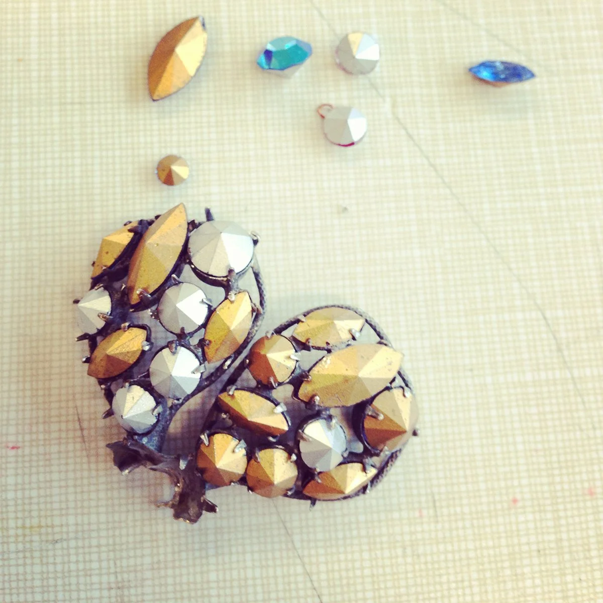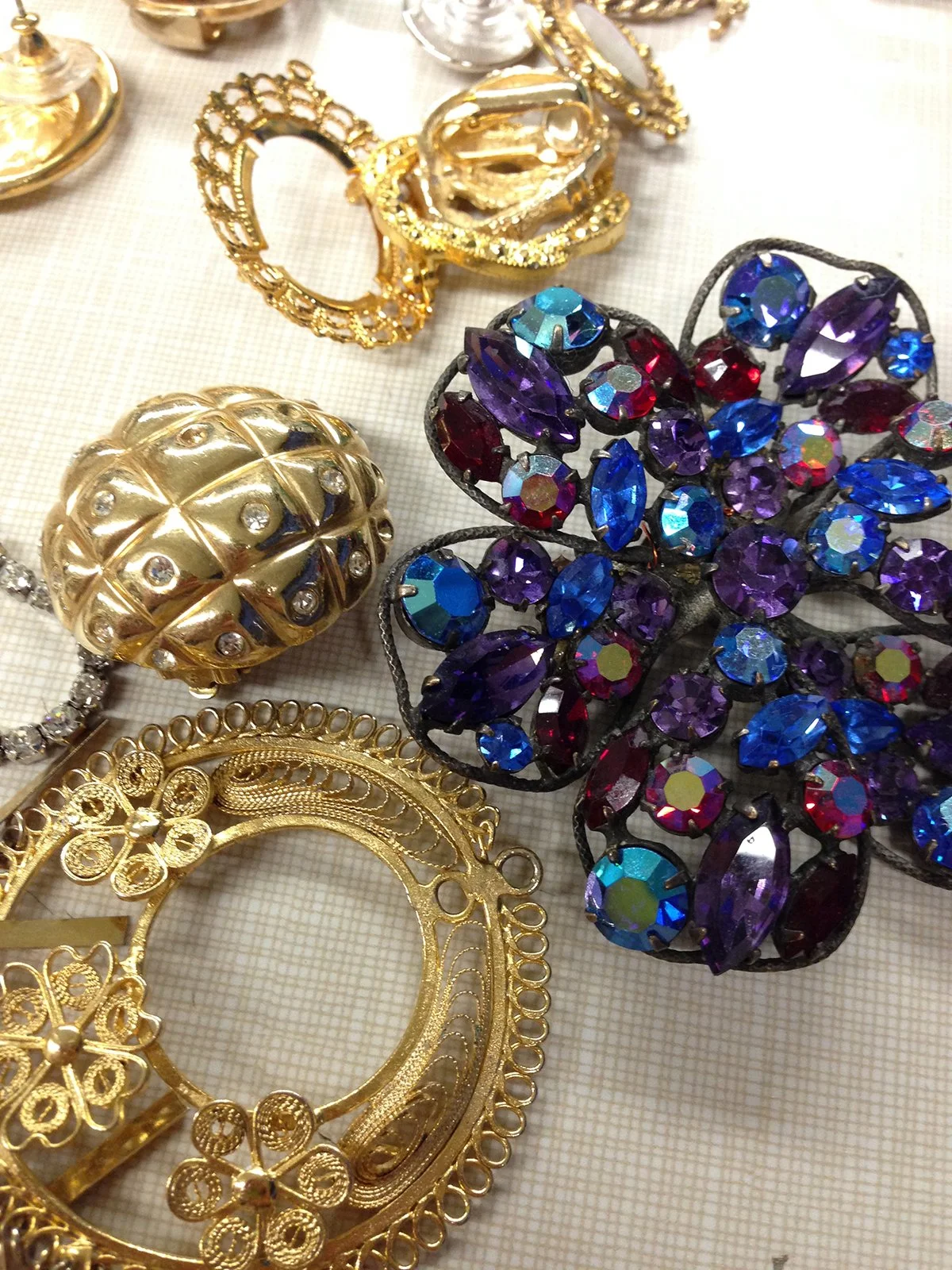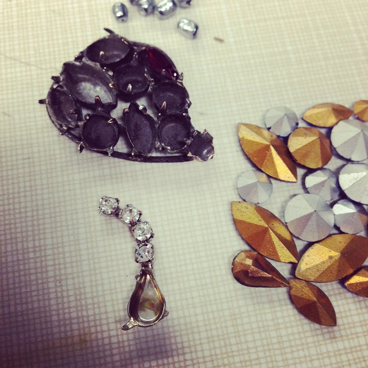 While reflecting on my first RJM experience at Penland School of Craft years ago I remember the materials I gravitated towards. I enjoyed costume jewelry and its falsified faceted stones and gold leaf. I enjoyed the clustered settings that the stones filled on this jewelry and, once removed, the beautiful recessed cavities that were hidden beneath. After dissecting, rolling and crushing these forms, there would be no resemblance to the jewelry it once was. It became just material, a new start for a new jewelry piece to be created!