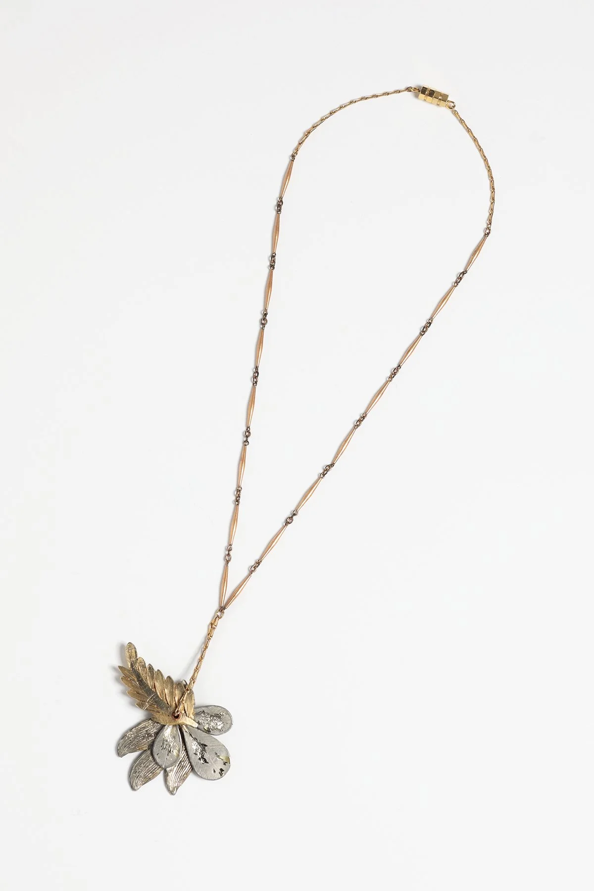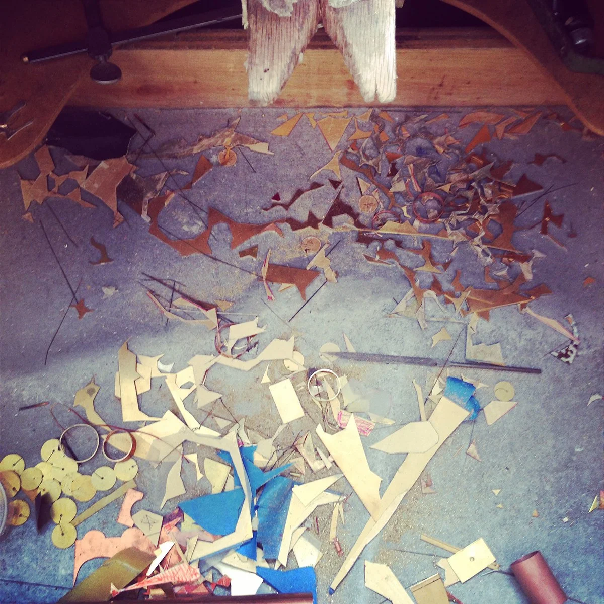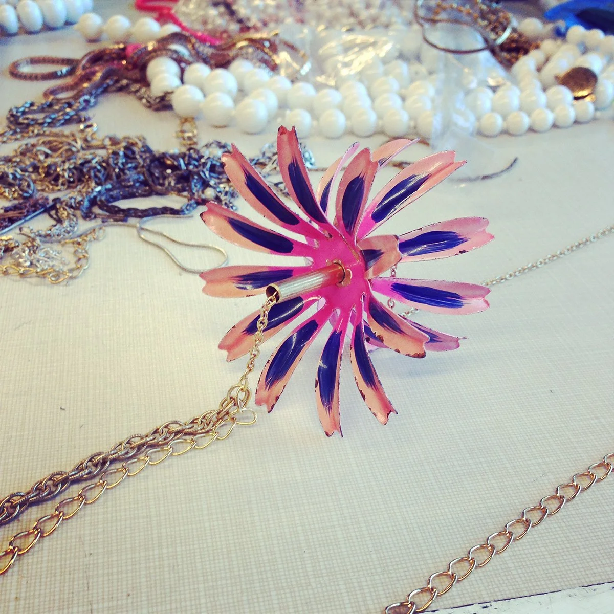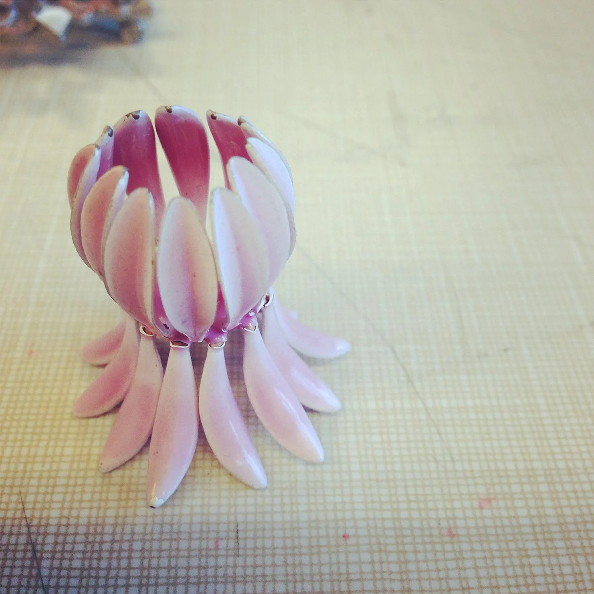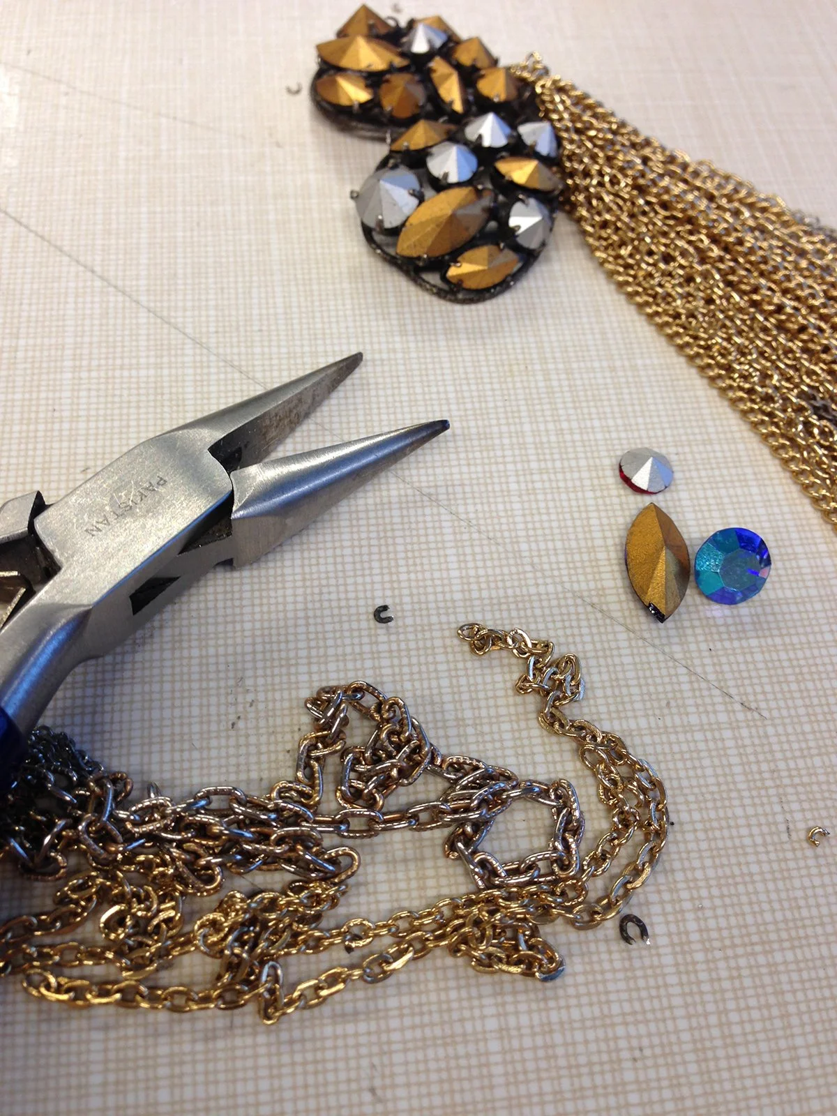 While reflecting on my first RJM experience at Penland School of Craft years ago I remember the materials I gravitated towards. I enjoyed costume jewelry and its falsified faceted stones and gold leaf. I enjoyed the clustered settings that the stones filled on this jewelry and, once removed, the beautiful recessed cavities that were hidden beneath. After dissecting, rolling and crushing these forms, there would be no resemblance to the jewelry it once was. It became just material, a new start for a new jewelry piece to be created!