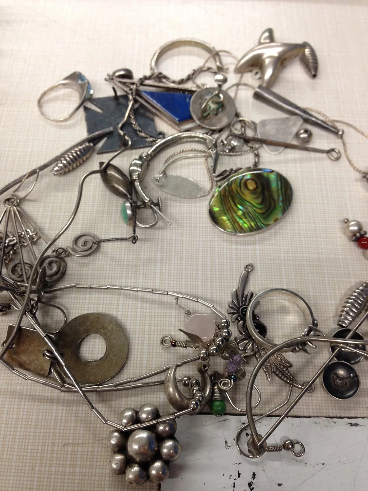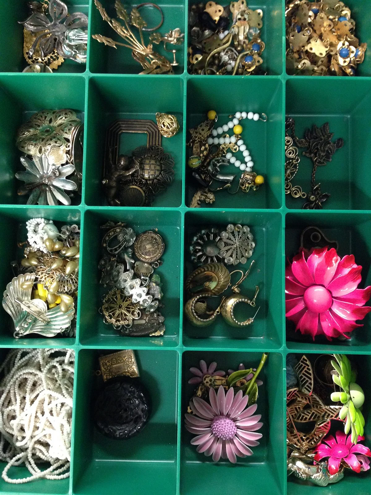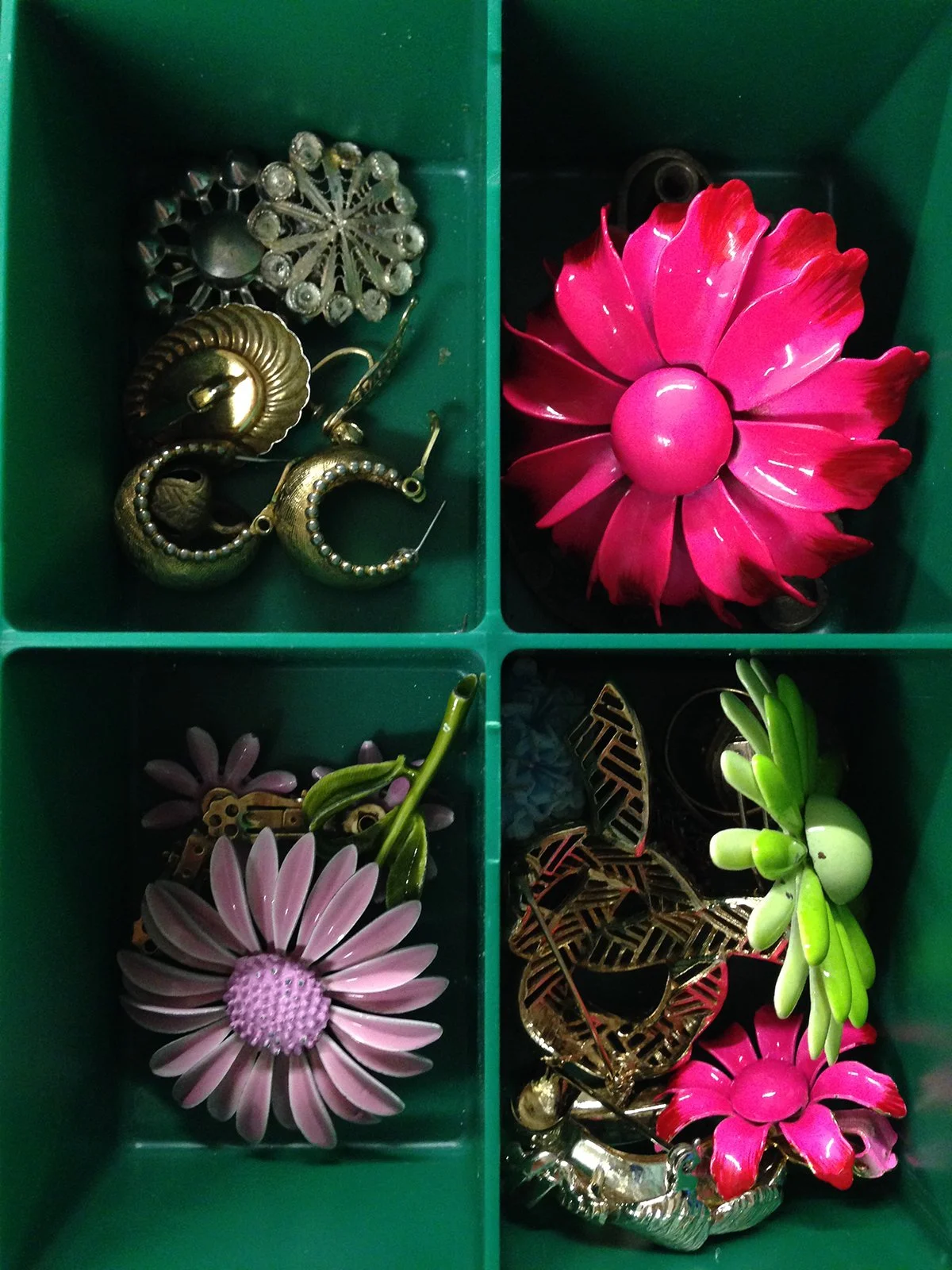 “Practical decisions” are ringing in my head today as I work on my RJM jewelry. My first piece, a brooch, is nearly completed. I still have the difficult task of integrating the findings on the back. It's been looming over me since I have decided to work with costume jewelry brooches, many of which are composed of brittle pot metal. Surprisingly, I actually enjoy working with it, as most jewelers would cringe at the thought.